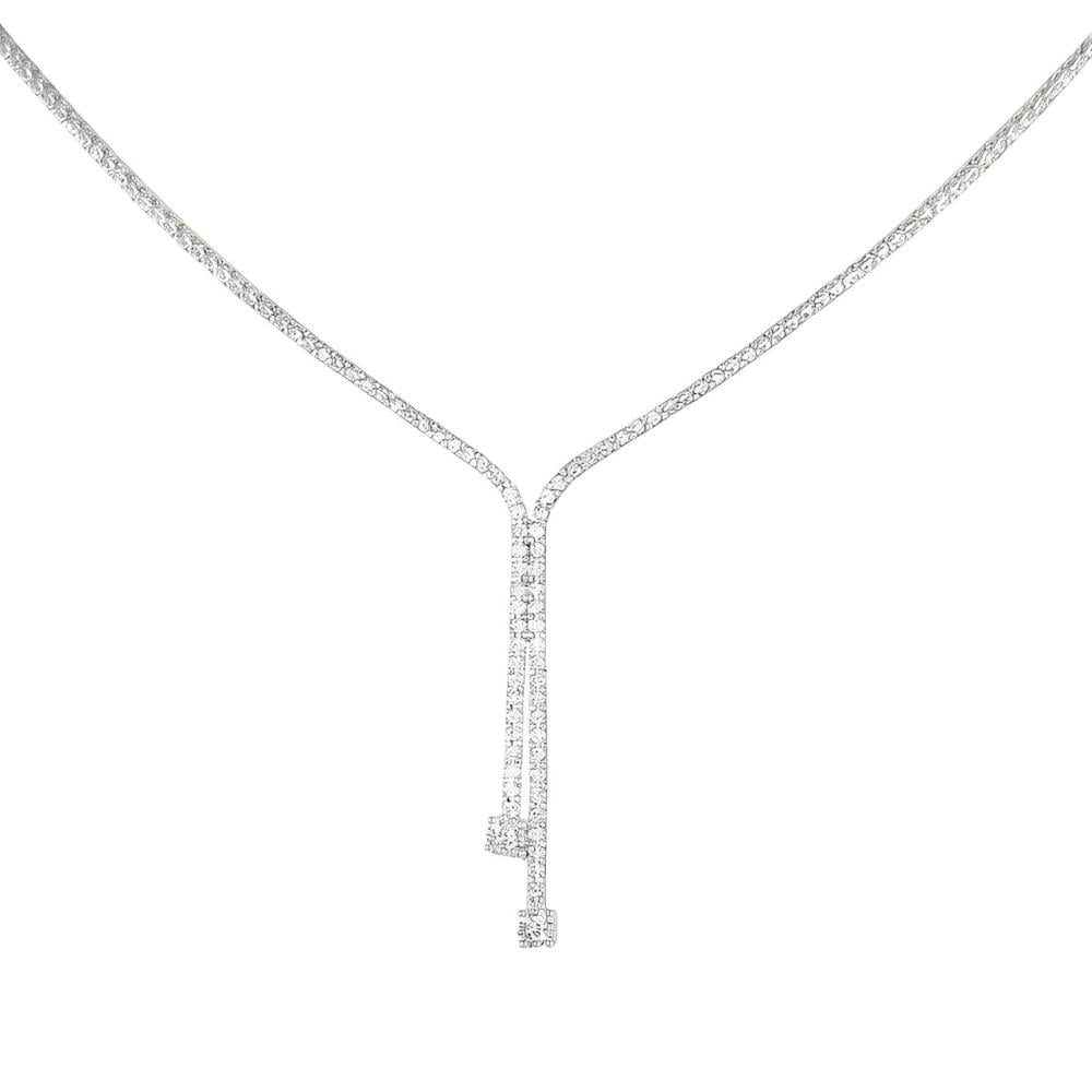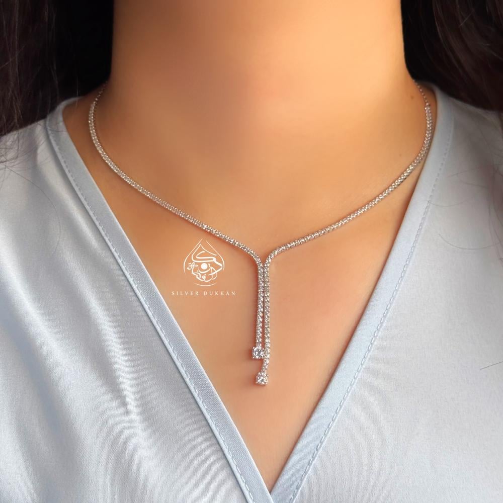 عقد فضة فاخر عيار 925، مرصع بأحجار الزركون اللامعة بدقة تضاهي الألماس. يتميز بتصميم أنيق وعصري على شكل حرف Y مع إمكانية التحكم بالطول عبر حلقات خلفية، ليمنحك حرية التألق في كل المناسبات.