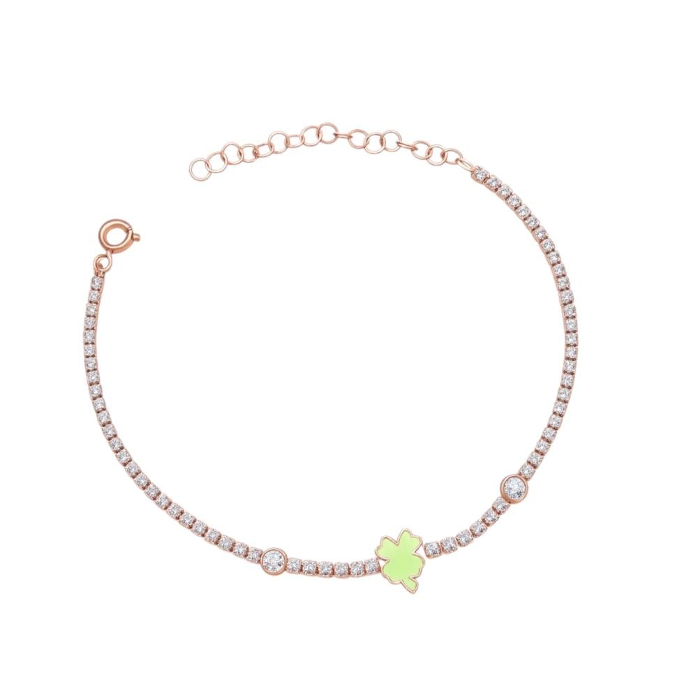 A luxurious bracelet that combines elegance and femininity with a delicate rose gold-plated design studded with shiny zircon that reflects the light with a sophisticated sparkle. A centerpiece, an apple-green rose pendant symbolizes luck and radiance, adding a touch of elegance to your everyday look or special occasions.